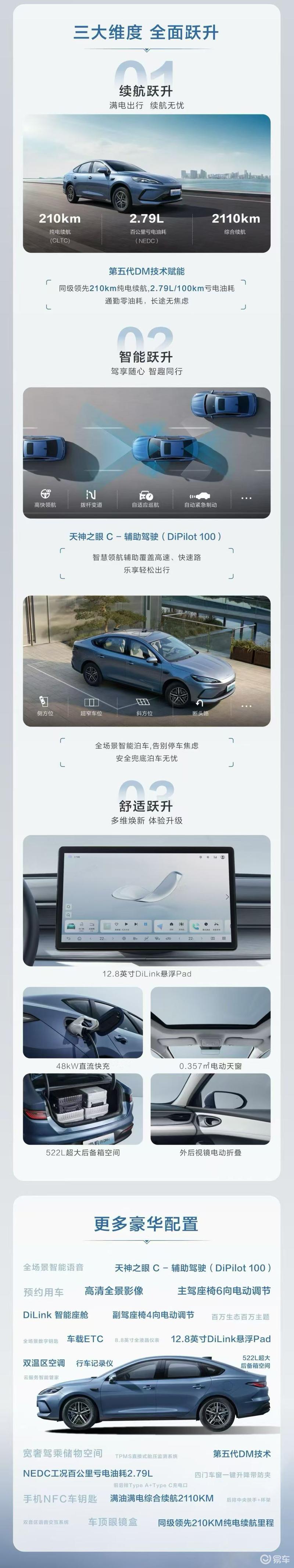 2026款海豹05DM-i搭载了主驾6向电动调度、副驾4向电动调度、12.8英寸DiLink大屏、全景影像、TPMS平直式系统、48kW直流快充、双温区空调等成立。此外还搭载了同级鲜有的天使之眼 C - 扶助驾驶(DiPilot 100),维持高快领航、智能停车、拨杆变谈等20余项功能。能源方面,2026款海豹05DM-i本次上市的两款新车型搭载比亚迪第五代DM本事,纯电续航可达210km,满油满电概括续航里程可达2110km。