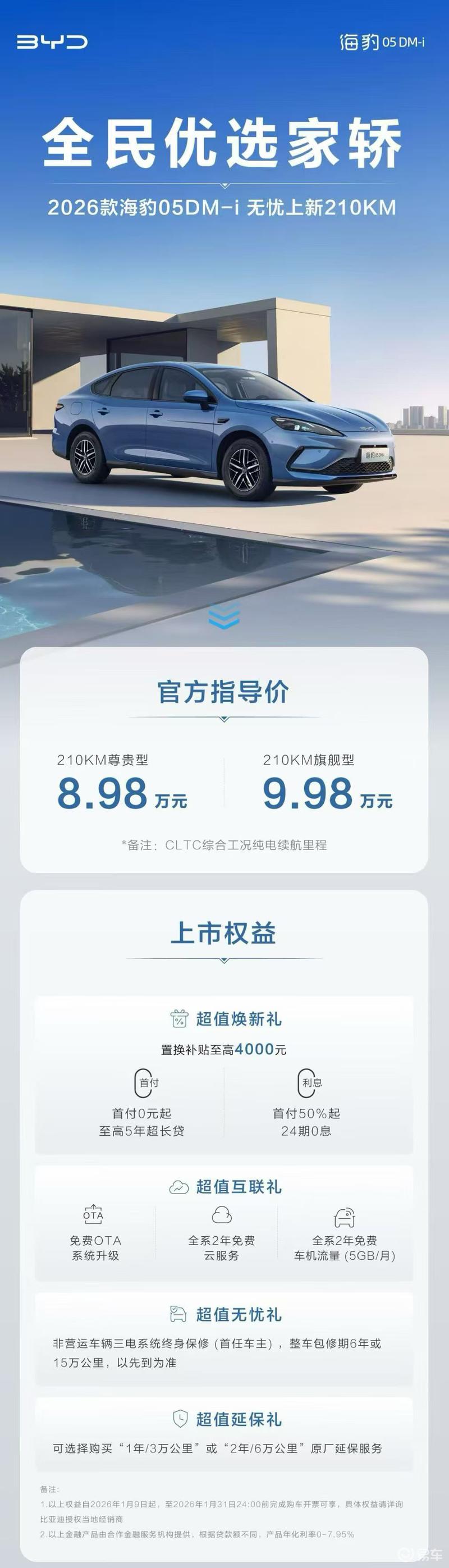 易车讯 1月9日,比亚迪2026款05DM-i与海豹06DM-i超享版分手加推两款纯电续航高达210km的全新车型,其中,2026款海豹05DM-i加推210KM尊贵型、210KM旗舰型,官方售价8.98-9.98万元;海豹06DM-i超享版加推210KM尊享型、210KM旗舰型,官方售价11.68-12.68万元。