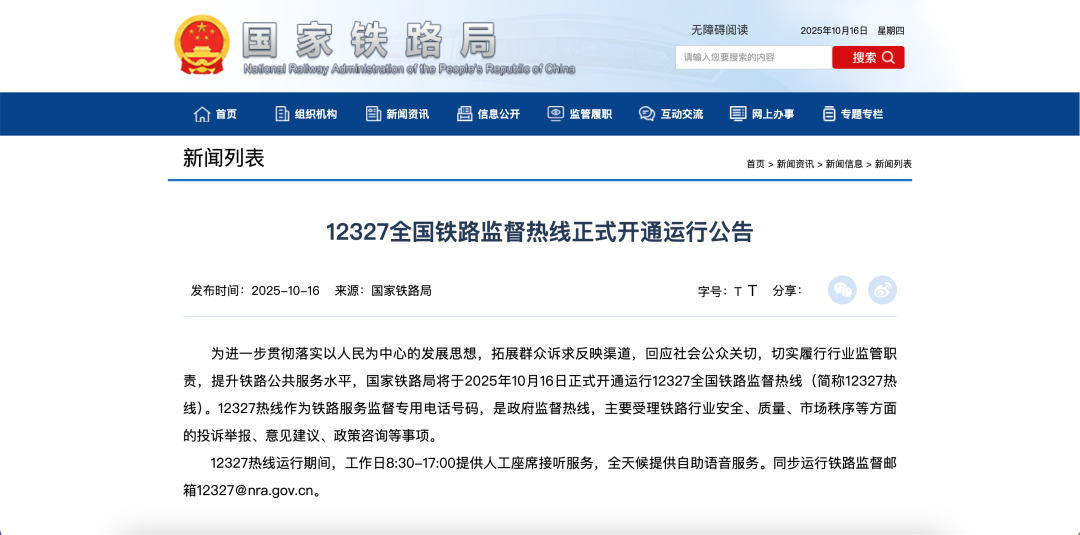 10月16日体育游戏app平台,国度铁路局官网发布《12327世界铁路监督热线细致盛开初始公告》。