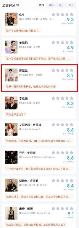 紧接着,网友们驱动为歌手们演唱的歌曲进行打分,从评分上看,GAI带来的《山城棒棒军》赢得的分数最高,为9.3分,紧随自后的是米奇、乔丹、艾莉西亚,然则看到陈楚生《小情歌》的评分后,网友们忍不住问:这是持重的吗?