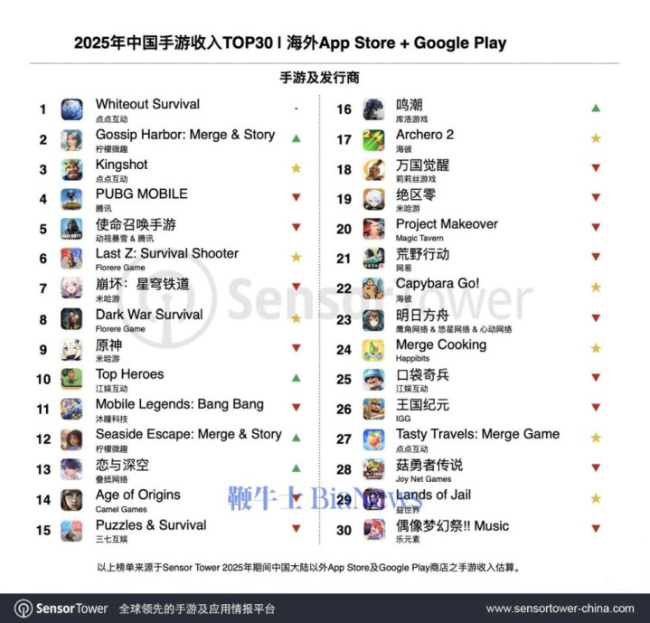 而到了出海手游收入榜上开云体育,点点互动《WhiteoutSurvival》2025年国际收入显赫高涨32%,跨越16.5亿好意思元,蝉联2025年出海手游收入榜冠军。好意思国、韩国和日本市集统统孝敬64%的国际总收入。