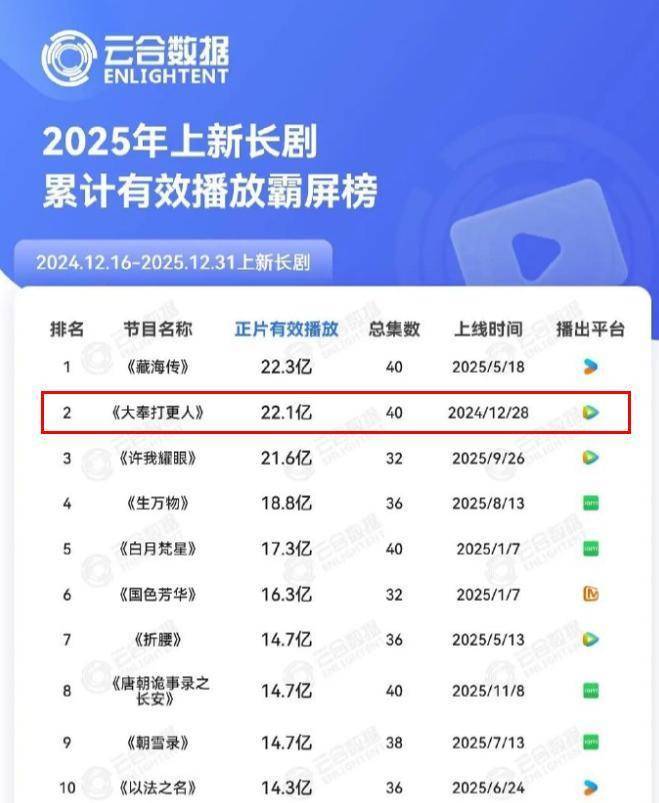 《大奉击柝东说念主》大结局后,不少网友调侃王鹤棣,毕竟该剧收获未达理念念。但它果真毫无亮眼之处吗?近日,官方发布的2025年上新长剧积攒灵验播放霸屏榜中,共有20部电视剧入选。