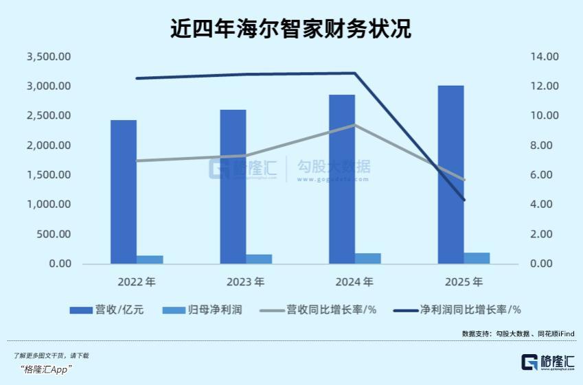 但对比2022年至2024年,这三年间海尔智家净利润增速均杰出10%,2025年的功绩,就小巫见大巫。