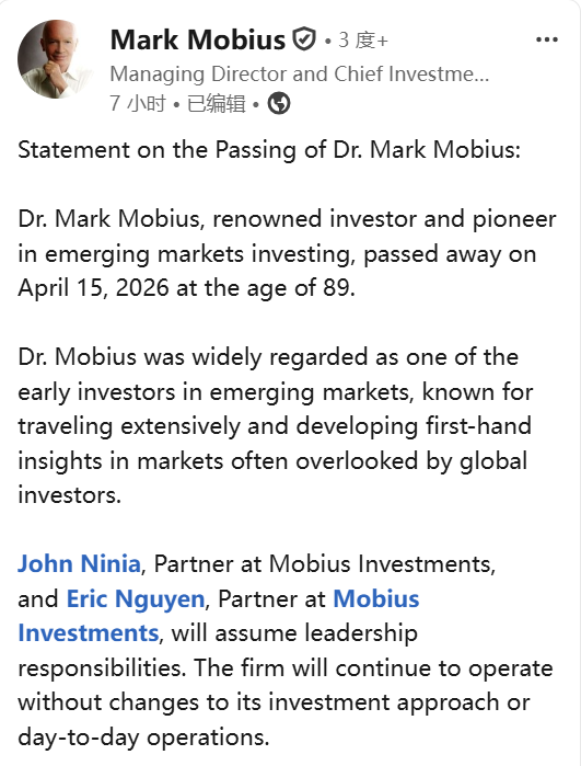 资深投资者、“新兴阛阓教父”麦朴想(Mark Mobius)于2026年4月15日陨命,享年89岁。